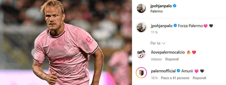 Un semplice «Forza Palermo 💗🖤» è bastato a scatenare l’entusiasmo dei tifosi rosanero. Joel Pohjanpalo, protagonista assoluto di questo avvio di stagione, ha pubblicato sul proprio profilo Instagram una foto che lo ritrae in maglia rosa, raccogliendo in poche ore centinaia di commenti e migliaia di like.