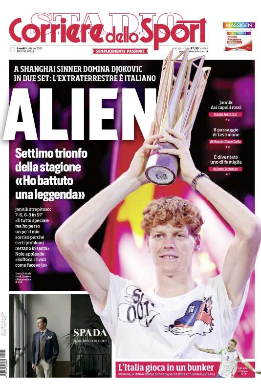 L’edizione odierna de Il Corriere dello Sport dedica la prima pagina interamente a Sinner vittorioso a Shanghai.