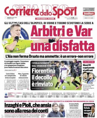 Prima pagina Corriere dello Sport: “Arbitri e Var una disfatta. L’Aia non ferma Orsato ma ammette: «E’ un errore-non errore»”