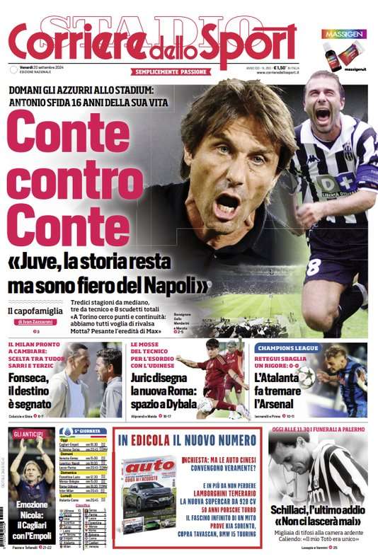 Prime pagine Prima pagina Corriere dello Sport: “Conte contro Conte” Segui Ilovepalermocalcio su Google News Redazione Ilovepalermocalcio Settembre 20, 2024 L’edizione odierna de il “Corriere dello Sport” dedica un titolo in prima pagina ad Antonio Conte. Continue Reading Previous Prima pagina Repubblica Palermo: “Addio Totò””Next Prima pagina Giornale di Sicilia: “Con Totò nel cuore”