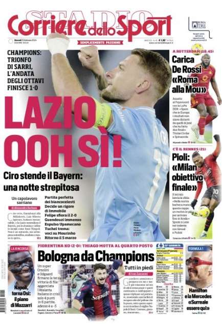 Prime pagine Prima pagina Corriere dello Sport: “Lazio, oh si!” Segui Ilovepalermocalcio su Google News Redazione Ilovepalermocalcio Febbraio 15, 2024 L’edizione odierna de “Il Corriere dello Sport” dedica la prima pagina alla Lazio e la vittoria in Champions. Continue Reading Previous Prima pagina Gazzetta dello Sport: “Fanta Lazio”Next Prima pagina Tuttosport: “Juve, scatto Zaccagni”