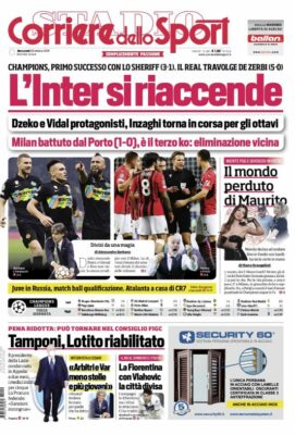 Prima Pagina Corriere dello Sport: “L’Inter si riaccende, Milan battuto dal Porto”