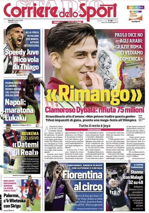 Prima pagina Corriere dello Sport: “Palermo, c’è Wieteska con Sirigu””
