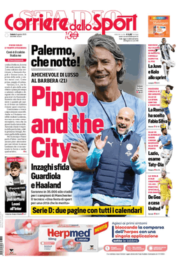 PALERMO Prime pagine Prima pagina Corriere dello Sport: “Palermo, che notte!” Segui Ilovepalermocalcio su Google News Redazione Ilovepalermocalcio Agosto 9, 2025 Stasera l’attesissima sfida al Manchester City Continue Reading Previous Guardiola: «A Palermo atmosfera speciale, non vedo l’ora di vivere questa serata»Next Una Galassia per Pippo