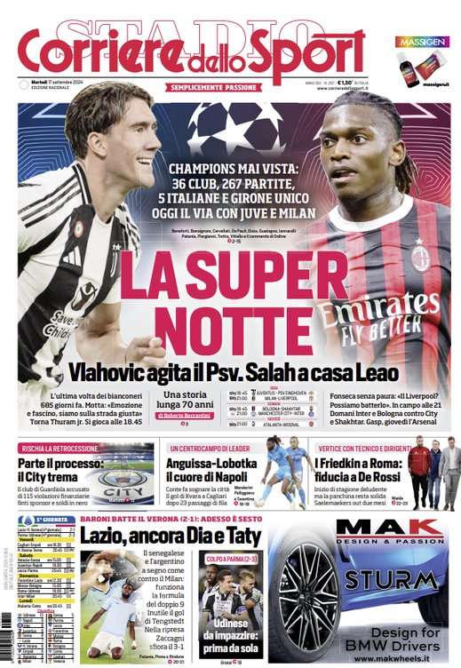 L’edizione odierna de Il Corriere dello Sport dedica un titolo in prima pagina al processo al Manchester City.