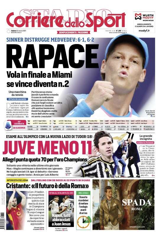 Prime pagine Prima pagina Corriere dello Sport: “Rapace” Segui Ilovepalermocalcio su Google News Redazione Ilovepalermocalcio Marzo 30, 2024 L’edizione odierna de “Il Corriere dello Sport” dedica la prima pagina a Sinner. Continue Reading Previous Prima pagina Giornale di Sicilia: “Il maxi buco del Superbonus”Next Prima pagina Gazzetta dello Sport: “Uragano Sinner”