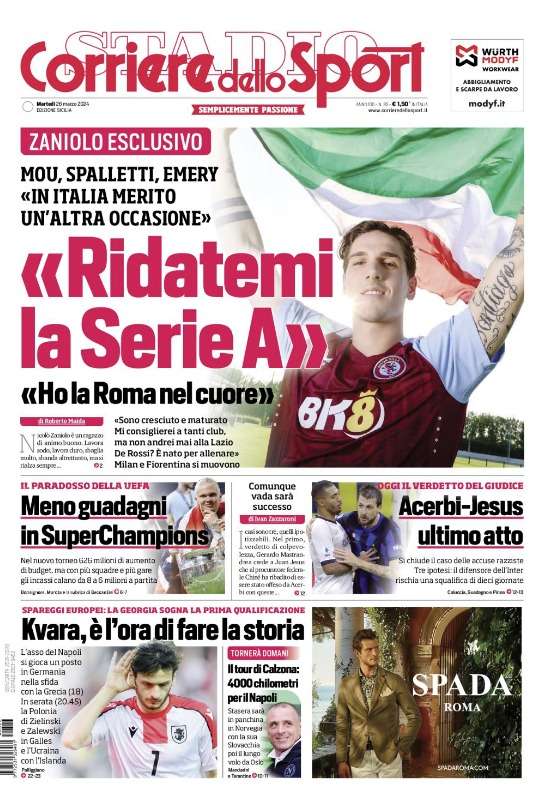L’edizione odierna de “Il Corriere dello Sport” dedica la prima pagina a Zaniolo.