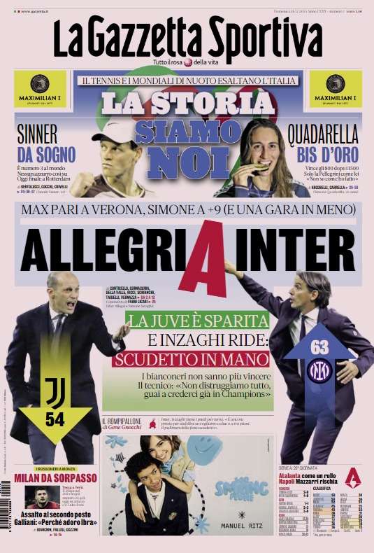 Prime pagine Prima pagina Gazzetta dello Sport: “AllegriA Inter” Segui Ilovepalermocalcio su Google News Redazione Ilovepalermocalcio Febbraio 18, 2024 L’edizione odierna de “La Gazzetta dello Sport” dedica la prima pagina alla Juve e all’Inter. Continue Reading Previous Prima pagina Tuttosport: “Sinner, per noi numero 1”Next Prima pagina Giornale di Sicilia: “Altavilla piange il suo supplizio”