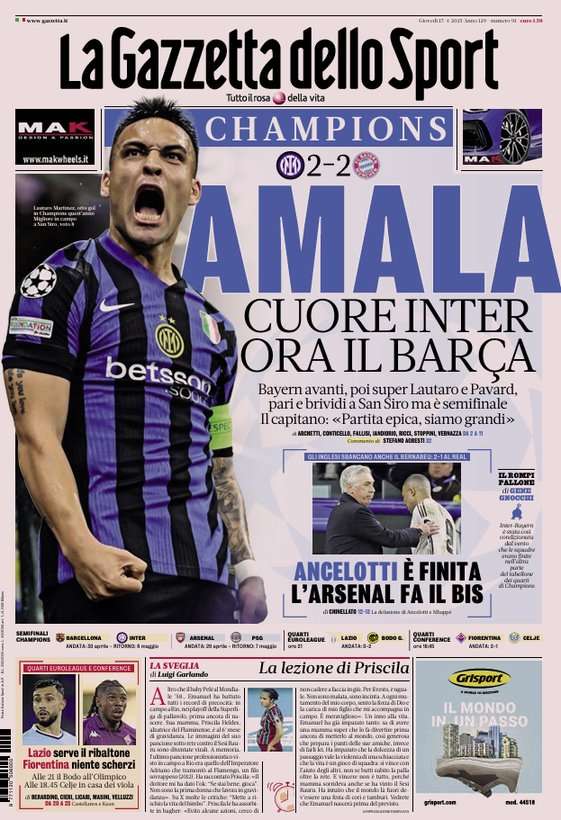 Prime pagine Prima pagina Gazzetta dello Sport: “Amala” Segui Ilovepalermocalcio su Google News Redazione Ilovepalermocalcio Aprile 17, 2025 L’Inter vola in semifinale di Champions Continue Reading Previous Prima pagina Corriere dello Sport: “Bye Bayern”Next Prima pagina Gazzetta dello Sport: “Inter, puoi tutto”