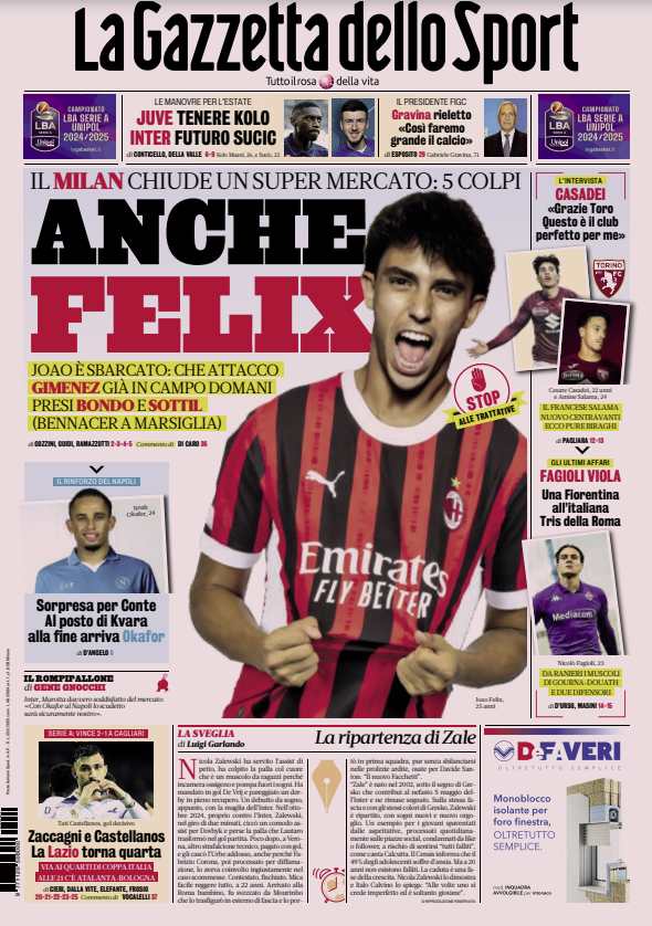 Prime pagine Prima pagina Gazzetta dello Sport: “Anche Felix” Segui Ilovepalermocalcio su Google News Redazione Ilovepalermocalcio Febbraio 4, 2025 L’edizione odierna de La Gazzetta dello Sport dedica un titolo in prima pagina al Milan. Continue Reading Previous Prima pagina Corriere dello Sport: “Scalata Palermo con Audero e Pohjanpalo”Next Prima pagina Tuttosport: “La Juve raddoppia con Kolo”