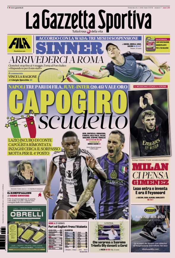 Uncategorized Prima pagina Gazzetta dello Sport: “Capogiro scudetto” Segui Ilovepalermocalcio su Google News Redazione Ilovepalermocalcio Febbraio 16, 2025 L’edizione odierna de La Gazzetta dello Sport dedica un titolo in prima pagina a Juve-Inter. Continue Reading Previous Prima pagina Repubblica Palermo: “Arriva il Mantova, i rosa si affidano a Pohjanpalo”Next Prima pagina Tuttosport: “Carica Motta, lamento Inzaghi”