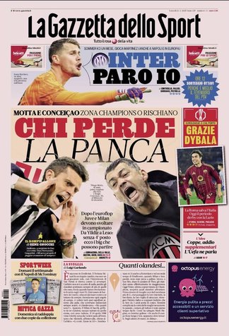Prime pagine Prima pagina Gazzetta dello Sport: “Chi perde la panca” Segui Ilovepalermocalcio su Google News Redazione Ilovepalermocalcio Febbraio 21, 2025 L’edizione odierna de La Gazzetta dello Sport dedica un titolo in prima pagina al Milan e Juventus. Continue Reading Previous Prima pagina Corriere dello Sport: “Dionisi a Cosenza può solo vincere”Next Prima pagina Tuttosport: “Juve, tre a rischio”
