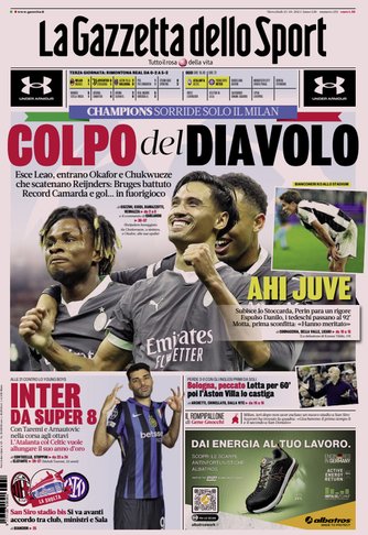 Prime pagine Prima pagina Gazzetta dello Sport: “Colpo del diavolo” Segui Ilovepalermocalcio su Google News Redazione Ilovepalermocalcio Ottobre 23, 2024 L’edizione odierna de La Gazzetta dello Sport dedica un titolo in prima pagina al Milan in Champions. Continue Reading Previous Prima pagina Corriere dello Sport: “Rincorsa Palermo, ha dieci punti in meno”Next Prima pagina Tuttosport: “Motta questa è brutta”