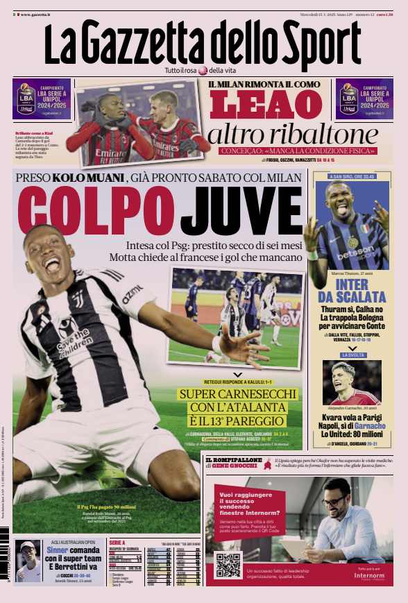 Prime pagine Prima pagina Gazzetta dello Sport: “Colpo Juve” Segui Ilovepalermocalcio su Google News Redazione Ilovepalermocalcio Gennaio 15, 2025 L’edizione odierna de La Gazzetta dello Sport dedica un titolo in prima pagina alla Juventus. Continue Reading Previous Prima pagina Corriere dello Sport: “Palermo, obiettivo Adorante. Allarme Barbera”Next Prima pagina Tuttosport: “Bella Juve ma sempre X”