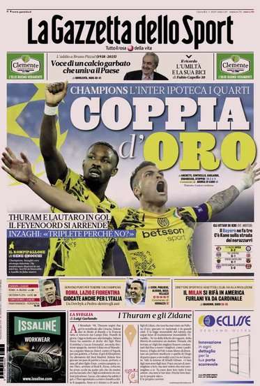 La prima pagina della Gazzetta dello Sport oggi in edicola si sofferma sulla grande vittoria dell’Inter in Champions