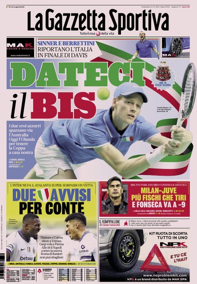 Prime pagine Prima pagina Gazzetta dello Sport: “Dateci il Bis” Segui Ilovepalermocalcio su Google News Redazione Ilovepalermocalcio Novembre 24, 2024 L’edizione odierna de “La Gazzetta dello Sport” dedica un titolo in prima pagina a Sinner e al tennis. Continue Reading Previous Prima pagina Corriere dello Sport: “Dionisi: «Tutti uniti per il Palermo»”Next Prima pagina Tuttosport: “Mai dire gol”