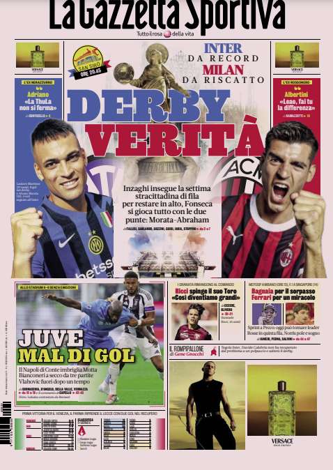 Prime pagine Prima pagina Gazzetta dello Sport: “Derby verità” Segui Ilovepalermocalcio su Google News Redazione Ilovepalermocalcio Settembre 22, 2024 L’edizione odierna de La Gazzetta dello Sport dedica un titolo in prima pagina al Derby tra Inter e Milan. Continue Reading Previous Prima pagina Corriere dello Sport: “Palermo protesta: mancano due rigori””Next Prima pagina Tuttosport: “Ok Thiago, ma chi segna?”