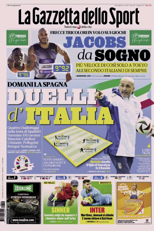 Prime pagine Prima pagina Gazzetta dello Sport: “Duelli d’Italia” Segui Ilovepalermocalcio su Google News Redazione Ilovepalermocalcio Giugno 19, 2024 L’edizione odierna de “La Gazzetta dello Sport” dedica la prima pagina all’Italia impegnata ad Euro 2024. Continue Reading Previous Prima pagina Corriere dello Sport: “Segre rinnova: contratto fino al 2027”Next Prima pagina Tuttosport: “Koop attacco Juve”