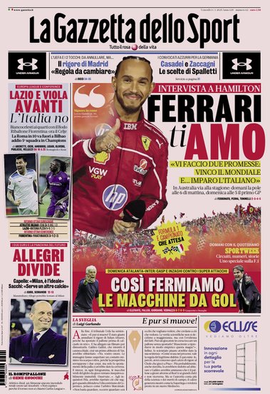 Prime pagine Prima pagina Gazzetta dello Sport: “Ferrari ti amo” Segui Ilovepalermocalcio su Google News Redazione Ilovepalermocalcio Marzo 14, 2025 L’edizione odierna de La Gazzetta dello Sport dedica un titolo in prima pagina alla Ferrari. Continue Reading Previous Prima pagina Corriere dello Sport: “Il Palermo chiede i playoff a Pohjanpalo”Next Prima pagina Tuttosport: “Juve, cosa spinge Mancini”