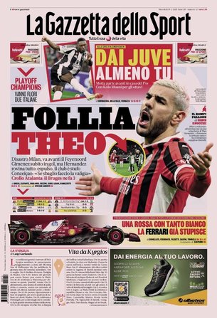 Prime pagine Prima pagina Gazzetta dello Sport: “Follia Theo” Segui Ilovepalermocalcio su Google News Redazione Ilovepalermocalcio Febbraio 19, 2025 L’edizione odierna de La Gazzetta dello Sport dedica un titolo in prima pagina al Milan e a Theo. Continue Reading Previous Prima pagina Corriere dello Sport: “Palermo, è allarme difesa”Next Prima pagina Tuttosport: “Juve-Inter, lo rifacciamo?”