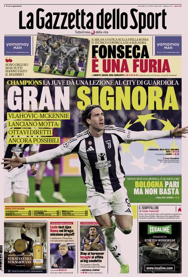 Prime pagine Prima pagina Gazzetta dello Sport: “Gran Signora” Segui Ilovepalermocalcio su Google News Redazione Ilovepalermocalcio Dicembre 12, 2024 L’edizione odierna de La Gazzetta dello Sport dedica un titolo in prima pagina alla Juventus. Continue Reading Previous Prima pagina Corriere dello Sport: “Dionisi porta il Palermo in ritiro”Next Prima pagina Tuttosport: “Favolosa”