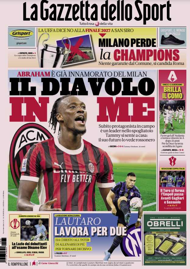 Prime pagine Prima pagina Gazzetta dello Sport: “Il diavolo in me” Segui Ilovepalermocalcio su Google News Redazione Ilovepalermocalcio Settembre 25, 2024 L’edizione odierna de La Gazzetta dello Sport dedica un titolo in prima pagina al Milan. Continue Reading Previous Prima pagina Corriere dello Sport: “«Palermo, ci vuole coraggio»”Next Prima pagina Tuttosport: “Il Toro dorme, l’arbitro pure”