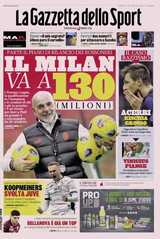 Prima pagina Gazzetta dello Sport: “Il Milan va a 130 milioni”