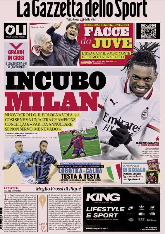 Prime pagine Prima pagina Gazzetta dello Sport: “Incubo Milan” Segui Ilovepalermocalcio su Google News Redazione Ilovepalermocalcio Febbraio 28, 2025 L’edizione odierna de La Gazzetta dello Sport dedica un titolo in prima pagina al Milan. Continue Reading Previous Prima pagina Corriere dello Sport: “Palermo, l’obiettivo rimane la serie A”Next Prima pagina Tuttosport: “Dubbi su Motta, quattro in corsa”