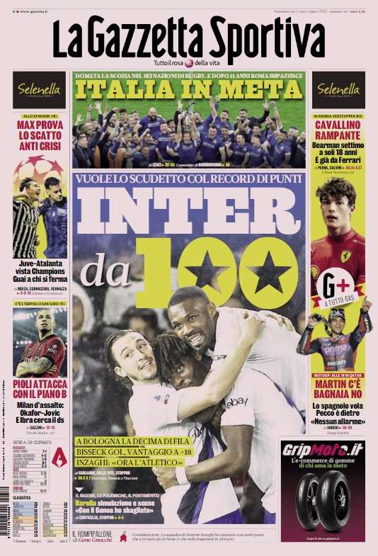 L’edizione odierna de “La Gazzetta dello Sport” dedica la prima pagina all’Inter che ieri ha vinto contro il Bologna.