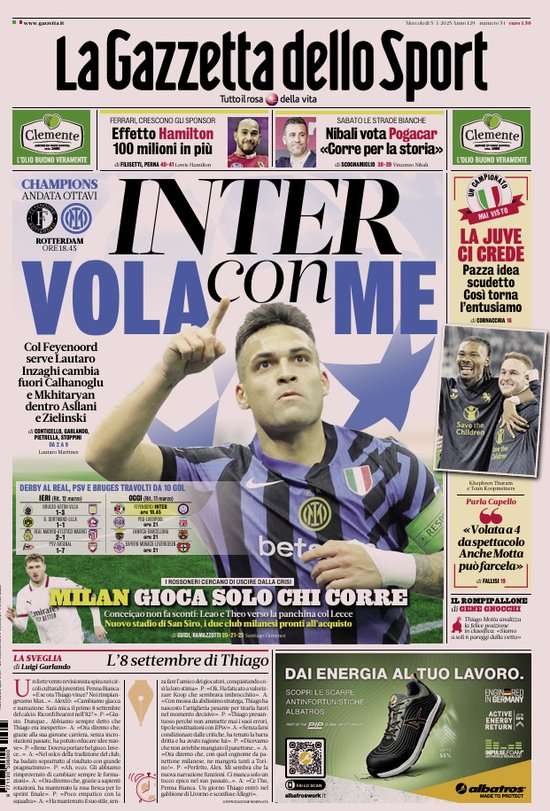Prime pagine Prima pagina Gazzetta dello Sport: “Inter, vola con me” Segui Ilovepalermocalcio su Google News Redazione Ilovepalermocalcio Marzo 5, 2025 L’edizione odierna de La Gazzetta dello Sport dedica un titolo in prima pagina all’Inter. Continue Reading Previous Prima pagina Tuttosport: “Hancko prove di Juve contro Lautaro”Next Prima pagina Repubblica Palermo: “Poltrone e aumenti ai manager, all’Ars il ritorno della casta”