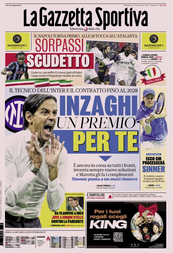 Prima pagina Gazzetta dello Sport: “Inzaghi, un premio per te”