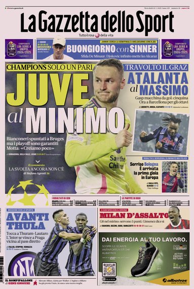 L’edizione odierna de La Gazzetta dello Sport dedica un titolo in prima pagina alle gare di Champions giocate ieri.