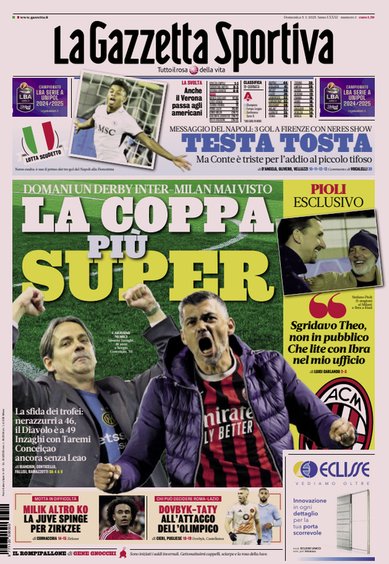 L’edizione odierna de La Gazzetta dello Sport dedica un titolo in prima pagina alla finale della Supercoppa.