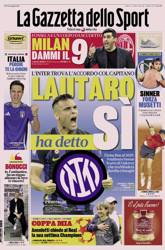Prime pagine Prima pagina Gazzetta dello Sport: “Lautaro ha detto sì” Segui Ilovepalermocalcio su Google News Redazione Ilovepalermocalcio Giugno 1, 2024 L’edizione odierna de “La Gazzetta dello Sport” si sofferma sull’Inter e sul rinnovo di Lautaro. Continue Reading Previous Prima pagina Corriere dello Sport: “Palermo in pressing per la firma di Zanetti”Next Prima pagina Tuttosport: “La Juve sfida il suo passato”