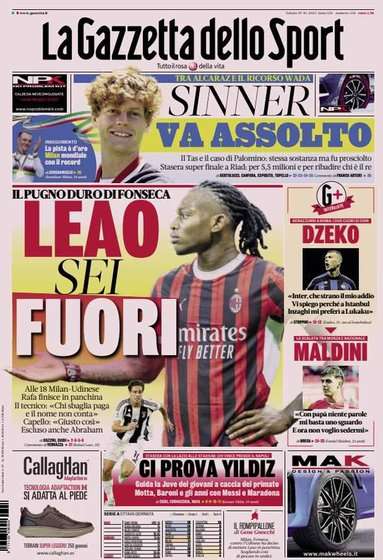 Prime pagine Prima pagina Gazzetta dello Sport: “Leao, sei fuori” Segui Ilovepalermocalcio su Google News Redazione Ilovepalermocalcio Ottobre 19, 2024 L’edizione odierna de La Gazzetta dello Sport dedica un titolo in prima pagina al Milan. Continue Reading Previous Prima pagina Corriere dello Sport: “Palermo d’assalto: Dionisi con Verre”Next Prima pagina Tuttosport: “Yildiz e Douglas per la svolta”
