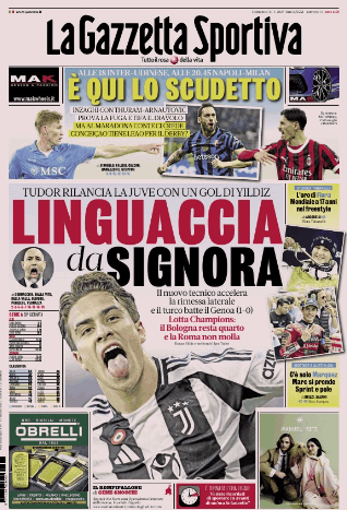 Prime pagine Prima pagina Gazzetta dello Sport: “Linguaccia da signora” Segui Ilovepalermocalcio su Google News Redazione Ilovepalermocalcio Marzo 30, 2025 L’edizione odierna de La Gazzetta dello Sport dedica un titolo in prima pagina alla Juventus. Continue Reading Previous Prima pagina Repubblica Palermo: “Rosa a Salerno, ultima chiamata per Dionisi”Next Prima pagina Tuttosport: “Yildiez”