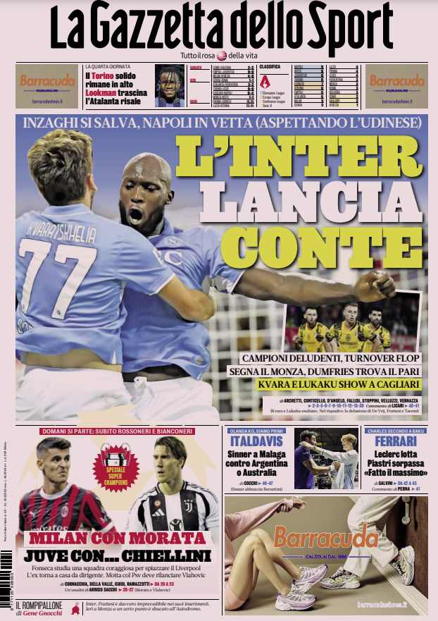L’edizione odierna de La Gazzetta dello Sport dedica un titolo in prima pagina ai risultati di Serie A e la classifica.
