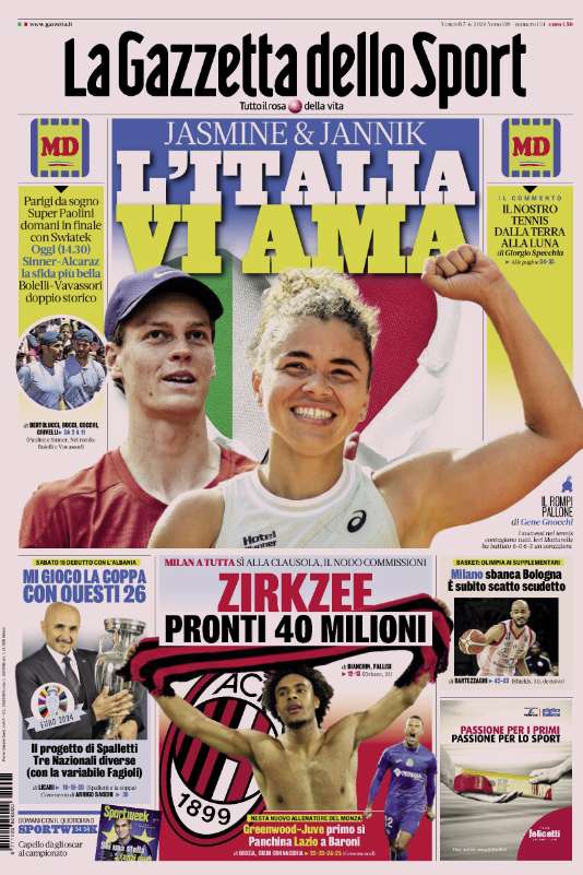 L’edizione odierna de “La Gazzetta dello Sport” dedica la prima pagina alle due stelle italiane del tennis, Sinner e Paolini.