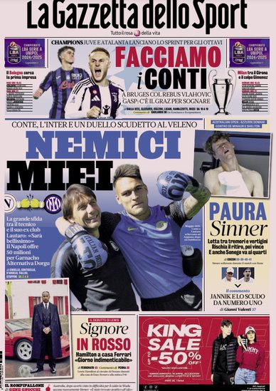 Prime pagine Prima pagina Gazzetta dello Sport: “Nemici miei” Segui Ilovepalermocalcio su Google News Redazione Ilovepalermocalcio Gennaio 21, 2025 L’edizione odierna de La Gazzetta dello Sport dedica un titolo in prima pagina a Inter e Napoli. Continue Reading Previous Prima pagina Corriere dello Sport: “Palermo, tentazione Pohjanpalo”Next Prima pagina Tuttosport: “Blitz Juve”