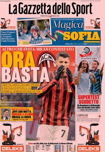 Prime pagine Prima pagina Gazzetta dello Sport: “Ora basta” Segui Ilovepalermocalcio su Google News Redazione Ilovepalermocalcio Dicembre 16, 2024 L’edizione odierna de La Gazzetta dello Sport dedica un titolo in prima pagina al Milan. Continue Reading Previous Prima pagina Corriere dello Sport: “Il Palermo affonda, fa festa il Catanzaro”Next Prima pagina Tuttosport: “Futuro Yildiz: «Io alla Juve tra 5 anni»”