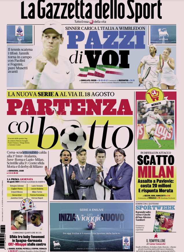 Prime pagine Prima pagina Gazzetta dello Sport: “Partenza col botto” Segui Ilovepalermocalcio su Google News Redazione Ilovepalermocalcio Luglio 5, 2024 L’edizione odierna de “La Gazzetta dello Sport” dedica la prima pagina alla nuova serie A. Continue Reading Previous Prima pagina Corriere dello Sport: “Palermo, Gomis firma per due anni”Next Prima pagina Tuttosport: “Quanti big match vicino alla Champions”