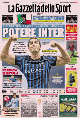 Prime pagine Prima pagina Gazzetta dello Sport: “Potere Inter” Segui Ilovepalermocalcio su Google News Redazione Ilovepalermocalcio Gennaio 15, 2026 Batte il Lecce e vola in classifica Continue Reading Previous Prima pagina Repubblica Palermo: “Si riparte con la legge mancia”