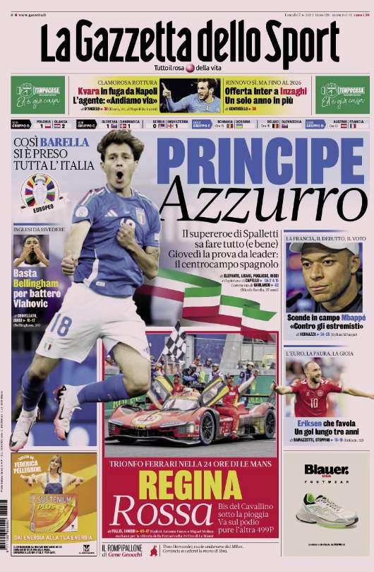 Prime pagine Prima pagina Gazzetta dello Sport: “Principe Azzurro” Segui Ilovepalermocalcio su Google News Redazione Ilovepalermocalcio Giugno 17, 2024 L’edizione odierna de “La Gazzetta dello Sport” dedica la prima pagina all’Italia e a Barella. Continue Reading Previous Prima pagina Corriere dello Sport: “Palermo idea Viola in alternativa a Mazzitelli”Next Prima pagina Tuttosport: “«Chiesa? Juve, tienitelo stretto»”