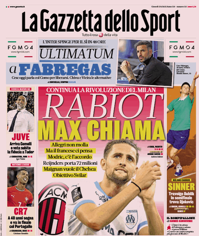 Prime pagine Prima pagina Gazzetta dello Sport: “Rabiot chiama Max” Segui Ilovepalermocalcio su Google News Redazione Ilovepalermocalcio Giugno 5, 2025 Il francese vuole il Milan Continue Reading Previous Prima pagina Corriere dello Sport: “Vignato sblocca Inzaghi”Next Prima pagina Tuttosport: “Juve, le richieste di Tudor”