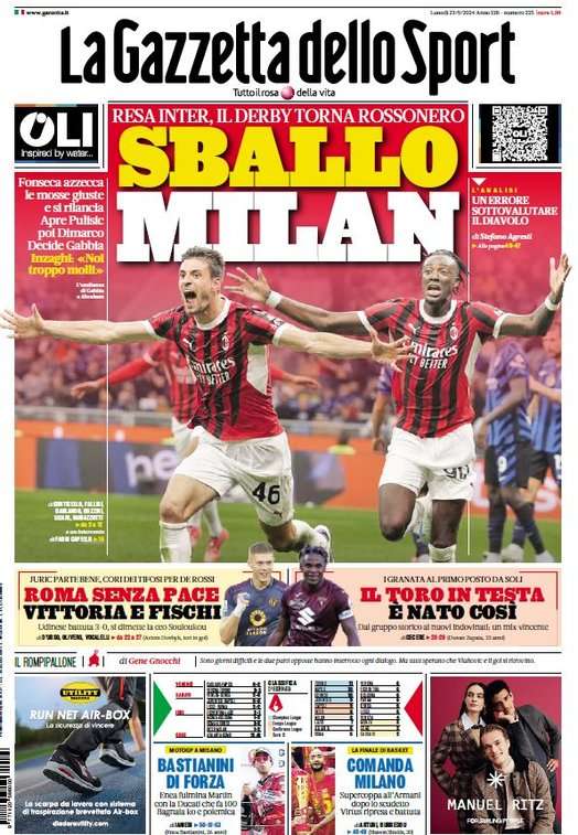 Prime pagine Prima pagina Gazzetta dello Sport: “Sballo Milan” Segui Ilovepalermocalcio su Google News Redazione Ilovepalermocalcio Settembre 23, 2024 L’edizione odierna de La Gazzetta dello Sport dedica un titolo in prima pagina al Milan e la vittoria nel Derby. Continue Reading Previous Prima pagina Corriere dello Sport: “Dionisi, missione al Maradona”Next Prima pagina Tuttosport: “Notte da Milan, Inter in gabbia”