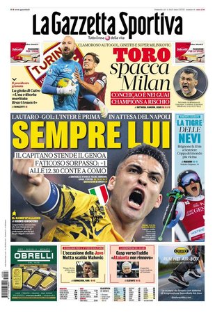 Prime pagine Prima pagina Gazzetta dello Sport: “Sempre lui” Segui Ilovepalermocalcio su Google News Redazione Ilovepalermocalcio Febbraio 23, 2025 L’edizione odierna de La Gazzetta dello Sport dedica un titolo in prima pagina all’Inter. Continue Reading Previous Prima pagina Tuttosport: “Sballo Toro”Next Prima pagina Giornale di Sicilia: “Vittoria scacciacrisi. Tris al Cosenza, il Palermo si rilancia”