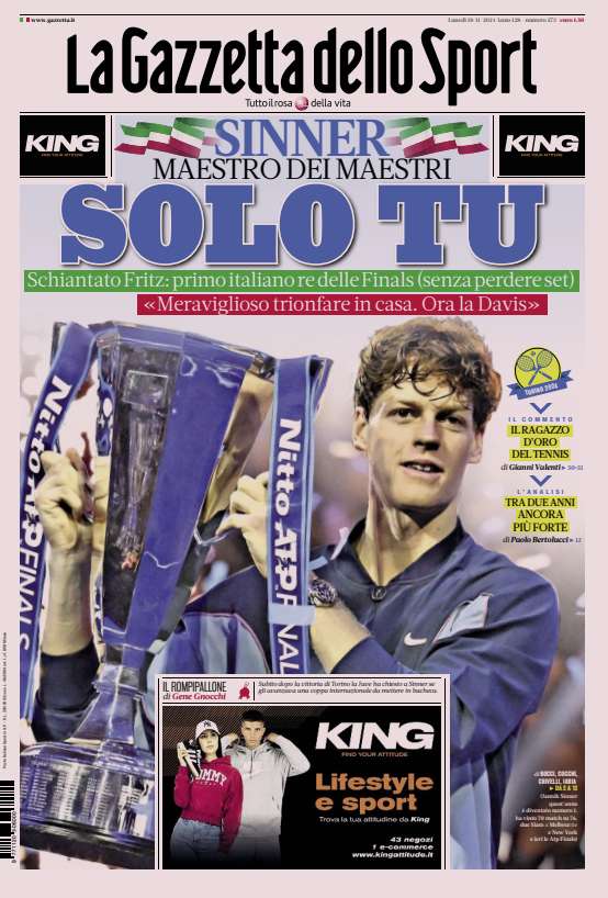 Prima pagina Gazzetta dello Sport: “Sinner maestro dei maestri, solo tu”