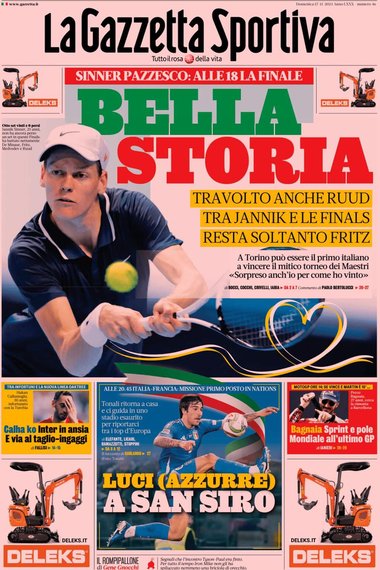 La prima pagina dell’edizione odierna de “La Gazzetta dello Sport” ha dedicato ampio e meritato spazio alla vittoria di Sinner su Ruud per 2 set a 0 nella semifinale ATP Finals di Torino. Stasera il tennista numero uno al mondo si giocherà la finale contro Fritz alle ore 18.
