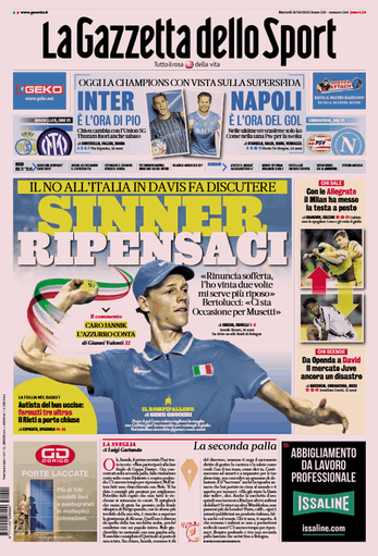 Prime pagine Prima pagina Gazzetta dello Sport: “Sinner, ripensaci” Segui Ilovepalermocalcio su Google News Redazione Ilovepalermocalcio Ottobre 21, 2025 Non vuole giocare la Davis Continue Reading Previous Prima pagina Repubblica Palermo: “Sanità, pazienti emigrati raddoppia la spesa”Next Prima pagina Tuttosport: “Tudor ha tempo fino al derby”