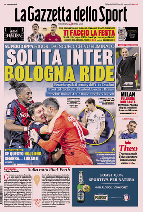 Prime pagine Prima pagina Gazzetta dello Sport: “Solita Inter” Segui Ilovepalermocalcio su Google News Redazione Ilovepalermocalcio Dicembre 20, 2025 Altra sconfitta per Chivu Continue Reading Previous Prima pagina Repubblica Palermo: “Via le norme della discordia”Next Prima pagina Tuttosport: “Napoli-Allegri, che bufera”